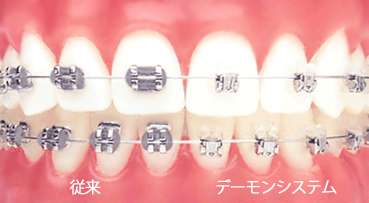 矯正の治療法にはいくつかありますが、当院ではデーモンシステムというアメリカの最新システムを導入しています。一般的に矯正といえば、歯の表側(唇側)の取り付けた“ブラケット”という矯正装置にワイヤーを通しワイヤーの弾力を利用して歯を少しずつ動かしていく方法です。通常ですとそのワイヤーをゴムや針金で固定するのですが、デーモンシステムでは固定はせずワイヤーを通すだけなので、動きに自由度がありより優しい力で早く歯を動かすことが出来ます。
